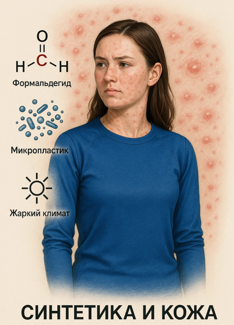 С ростом производства текстиля на основе полиэфиров, полиамида и других синтетических волокон в последние десятилетия всё больше внимания привлекает вопрос: безопасна ли такая одежда для нашей кожи? Синтетические материалы занимают около 60% мирового текстильного рынка, однако последствия их длительного ношения для здоровья кожи остаются недооценёнными. Синтетические ткани, такие как полиэстер, акрил, нейлон и спандекс, изготавливаются из нефтепродуктов и включают в себя множество химических соединений: формальдегид, фталаты, антипирены и остаточные мономеры. Эти вещества могут выделяться под действием тепла тела или ультрафиолетового излучения. Формальдегид, используемый для придания устойчивости к сминанию, был признан потенциальным канцерогеном Международным агентством по изучению рака (IARC). В исследовании, опубликованном в Journal of Environmental Health (2018), выявлено, что уровень формальдегида в некоторых синтетических тканях превышал безопасный порог в 5–8 раз. Натуральные