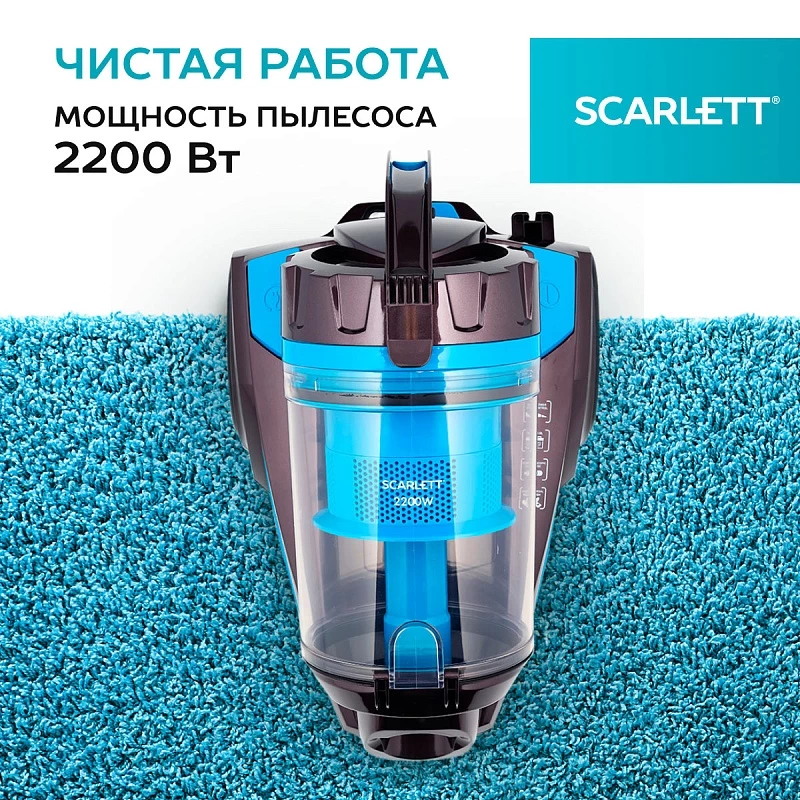 - Scarlett SC-VC80C377 — пылесос для чистки ковров с технологией "циклон", с оригинальным коричнево-синим корпусом. Это модель с мощностью всасывания 450 Вт, с 3-литровым контейнером. Есть регулировка мощности всасывания (расположена на задней части корпуса). В комплект входит три насадки (для пола, для щелей и для мебели). Модель легко перемещается по всей комнате благодаря длинному 5-метровому шнуру.