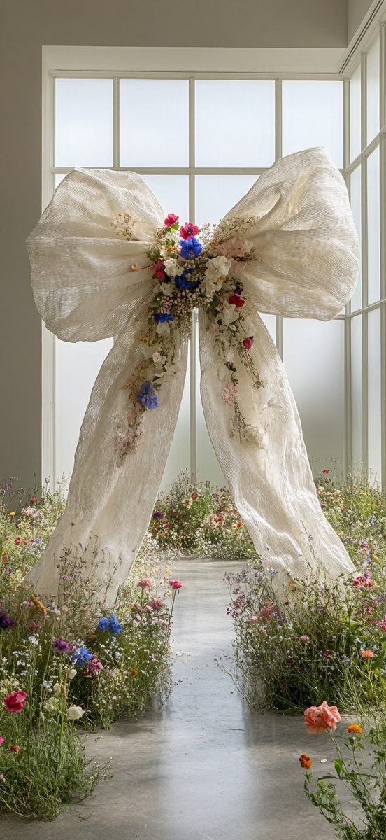 Создано на основе запроса: A giant bow made of white silk with embroidered flowers, an installation in a large, bright room surrounded by