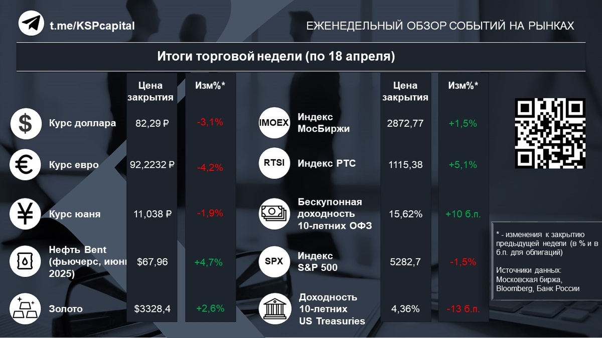 В четверг рынок акций РФ умеренно подрос на фоне укрепления нефти. По итогам торгов индекс «МосБиржи» составил 2865,32 пункта (+0,1%), индекс РТС – 1100,51 пункта (+0,8%). Цены большинства «голубых фишек» изменились в пределах 2,4%. Лучше рынка завершили день акции «Алроса» (+3,5%) и «Роснефти» (+3,5%), подешевели акции «ВК» (-1,9%) и АФК «Система» (-1,1%). Акции НЛМК опустились на 0,5%, выручка компании по МСФО за 2024 г. выросла на 5% до 979,6 млрд руб., в то время как чистая прибыль упала на 42% и составила 121,9 млрд руб. Вышедшие в среду вечером после завершения основной сессии на фондовой секции «Московской биржи» данные Росстата показали, что инфляция в РФ с 8 по 14 апреля составила 0,11% после 0,16% с 1 по 7 апреля. Из данных за 14 дней апреля этого и прошлого годов следует, что годовая инфляция в РФ на 14 апреля осталась на уровне конца марта и составила 10,34%.