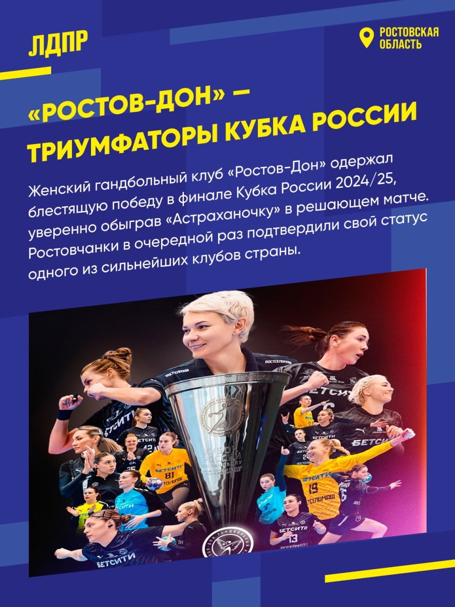 «Ростов-Дон» — триумфаторы Кубка России! 💠 Женский гандбольный клуб «Ростов-Дон» одержал блестящую победу в финале Кубка России 2024/25, уверенно обыграв «Астраханочку» в решающем матче. Ростовчанки в очередной раз подтвердили свой статус одного из сильнейших клубов страны, завоевав престижный трофей и подарив болельщикам бурю эмоций. Основанный в 1965 году под названием «Ростсельмаш», «Ростов-Дон» за десятилетия стал легендой российского гандбола. Сегодня это не только один из старейших, но и самых титулованных клубов России, который продолжает задавать высокую планку в женском гандболе. Финал Кубка России стал ярким доказательством мастерства и сплочённости команды. 💠 На площадке ростовчанки продемонстрировали мощь, точность и несгибаемый характер. «Астраханочка» оказала достойное сопротивление, но «Ростов-Дон» был на шаг впереди, благодаря отлаженной командной игре и тренерской стратегии. Каждая атака, каждый блок и каждый гол были пропитаны стремлением к победе. ✨✨✨ Ростовско