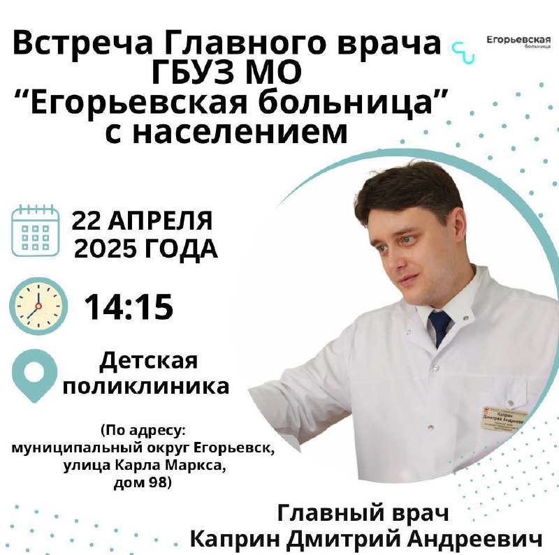 Жители муниципального округа Егорьевск встретятся с главным врачом Егорьевской больницы. Жителей округа приглашают на встречу с главным врачом Егорьевской больницы Дмитрием Каприным по вопросам здравоохранения. Встреча состоится: 22 апреля в 14:15 по адресу: детская поликлиника, улица Карла Маркса, дом 98. #подмосковье #НашеПодмосковье #муниципальныйокругЕгорьевск #моЕгорьевск #егорьевскоетелевидение #егорьевскоетв #Егорьевск #администрацияегорьевск