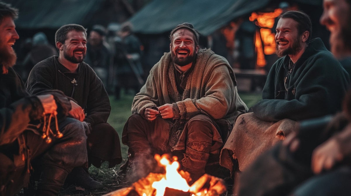 Создано на основе запроса: Medieval soldiers sitting around a campfire, one soldier telling a funny story, others laughing heartily