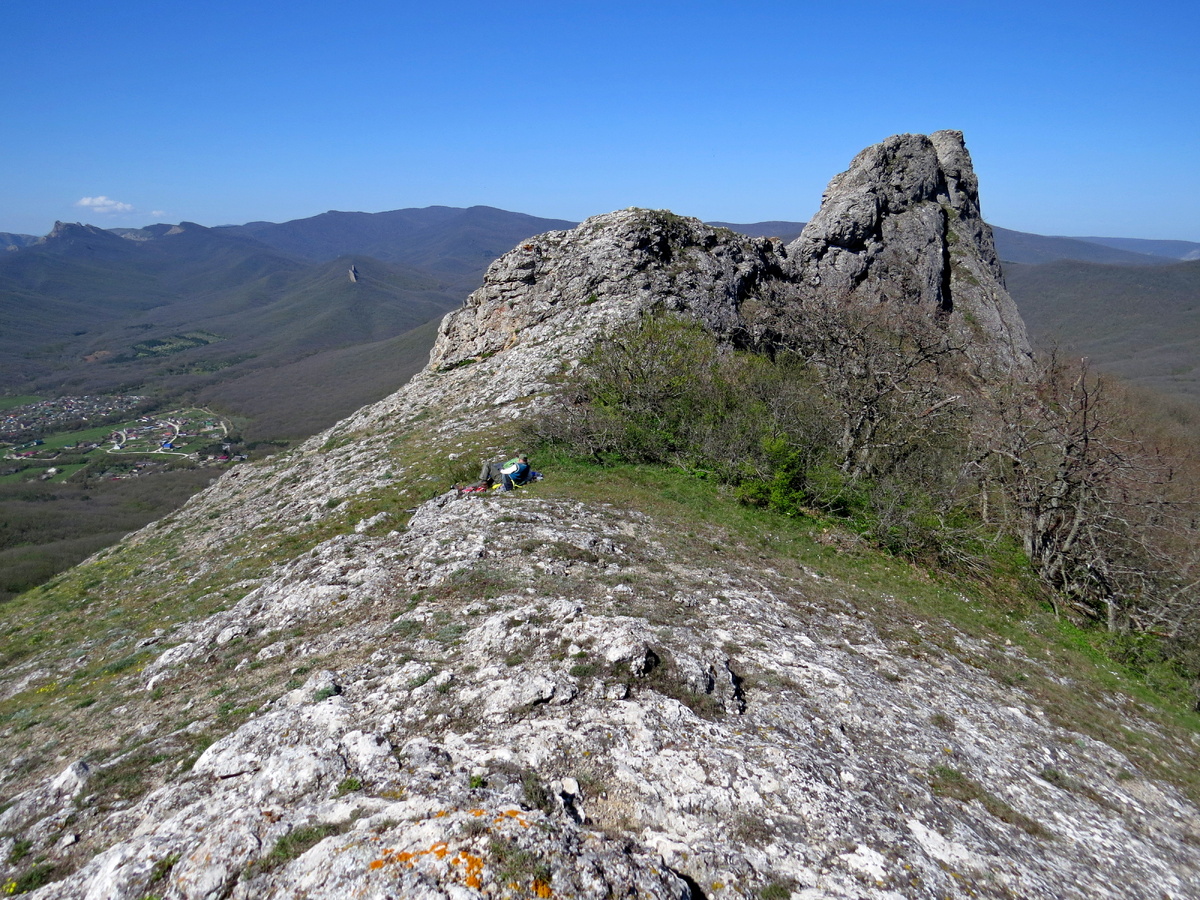 Пока Миша заваривал следующий чай в термос, мы с Виктором пошли немного пройтись по горе. Разве можно усидеть с фотоаппаратом в руках спокойно? Глаза бегают по дальним горам. Под ногами ковры цветов. Прекрасное время – весна! А вот и раскрывшийся первый лесной пион! Почти букет! Дальше решили вокруг ущелья на соседнюю вершину, которую я забыла сфотографировать со стороны. Там лысая вершинка и должны быть другие виды в другие стороны. Виктор, как обычно уже убежал вперед. Миша идет уже тоже далеко впереди. А я все приседаю у цветочков. То оглядываюсь назад, на Измаил-Кая. И ,через откуда- то взявшийся яркий лес ,мы снова выходим на ту самую лысую гору. А полян цветочных вокруг! Белых, сиреневых, желтых! Синие мускари капельками разбросаны по траве. Уже столько ярких впечатлений за полдня, что складывать уже не куда. Откуда-то вынырнул Виктор и увел меня в заросли чесночницы. Какие воздушные белые поляны! И снова от края и до края и за край! Не понятно, где цветы начинаются и где