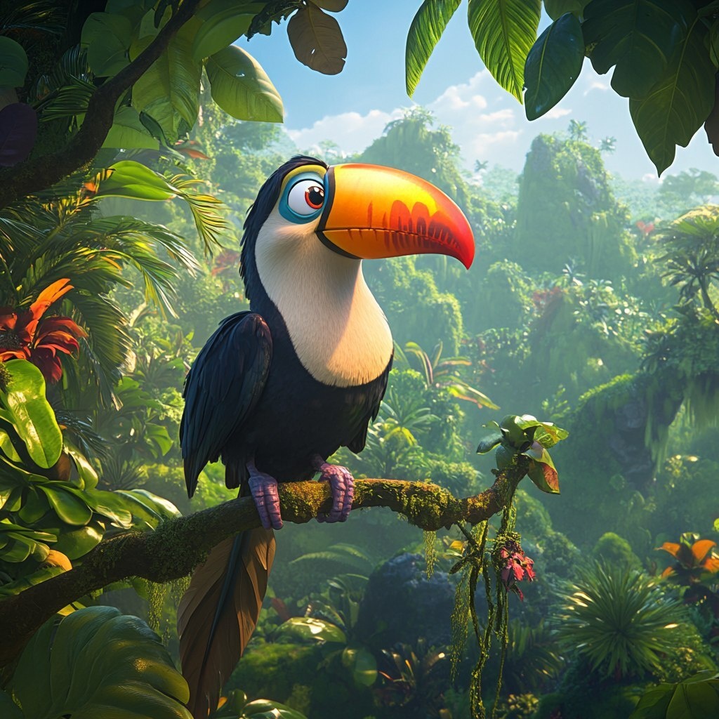 Создано на основе запроса: toucan in the rainforest, pixar style