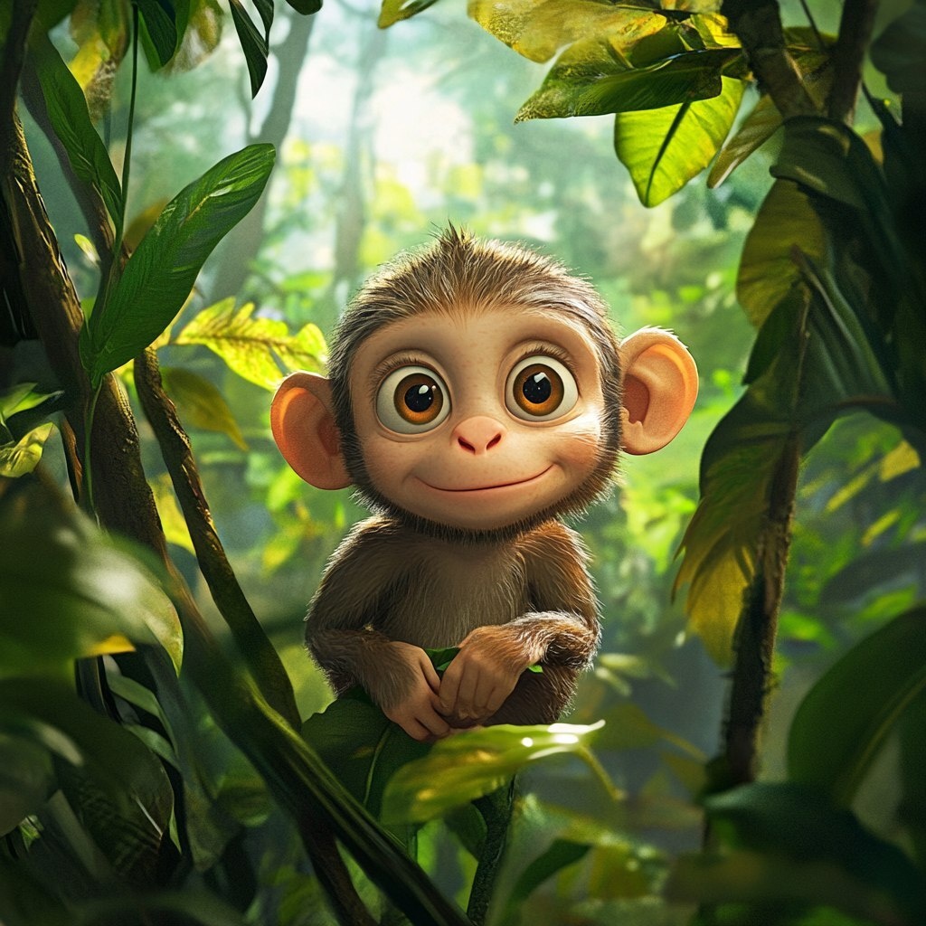 Создано на основе запроса: little monkey in the trees in the rainforest, pixar style