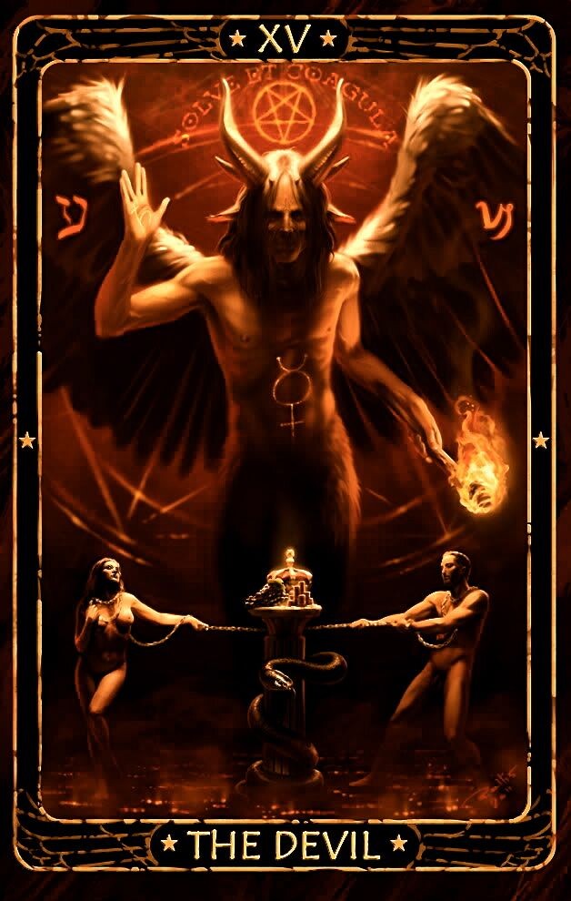 Таро изображает дьявола отвратительным, ужасающим. Эта карта может выпасть, когда вы оказались в ситуации, требующей от вас жесткости, даже беспощадности. Хотя большинство жизненных проблем лучше решаются посредством вежливости, общения и переговоров, к сожалению, бывает и иначе. Есть некоторые люди, агентства или силы, невосприимчивые к разуму и доброте, быть с ними в добрых отношениях бесполезно. Приходится поступать так, как будто имеешь дело с мошенниками, охотниками за чужим имуществом и другими криминальными элементами. В подобных случаях карта Дьявол говорит вам о необходимости принять жесткие меры против нечистоплотных людей, предпринять все необходимое для защиты себя и своих интересов. Иногда нужно следовать своим инстинктам хищника, чтобы защитить себя от нападения другого хищника. Если дело чрезвычайное и очень опасное, для самозащиты можно использовать губительную магию.