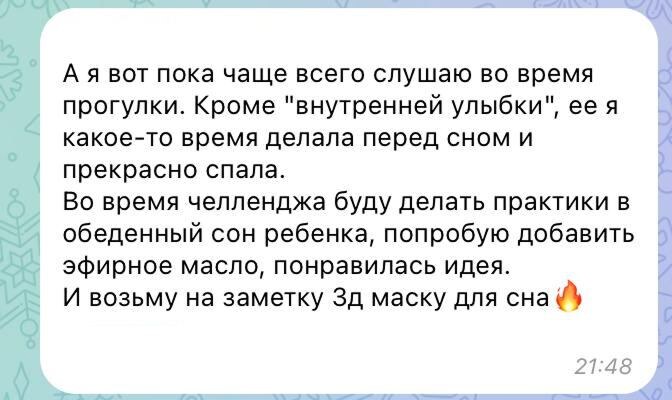 Такие отзывы мы получили уже в первый день нашего челленджа «Расцветай» — и это только начало! Хочешь к нам? Забирай доступ к пакету медитаций и телесных практик «Расцветай» — и присоединяйся к мотивирующему телеграм-чату с Никой Набоковой. 💙 Там тебя ждет 17 дней мягкой перезагрузки — с любовью к своему состоянию и телу. Но поторопись: сегодня последний день, когда можно присоединиться‼️ ➡️ Забрать «Расцветай» и вступить в закрытый чат