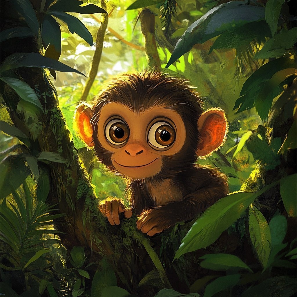 Создано на основе запроса: little monkey hiding in the trees in the rainforest, pixar style