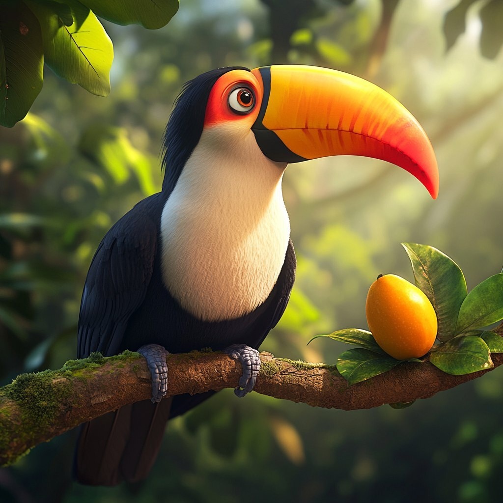 Создано на основе запроса: toucan sitting on a tree limb in the rainforest eating a mango, pixar style