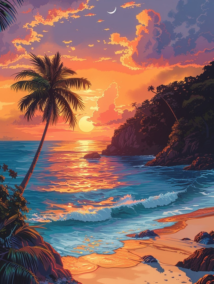Создано на основе запроса: A stylized bright wallpaper of a tropical island beach, golden sand with crashing turquoise waves, swaying palm trees casting exaggerated shadows, vibrant pink and orange clouds filling the sky at sunset. Fantasy-like glow and color saturation. Created Using: digital gouache brush set, synthwave-inspired palette, cel-shading technique, high contrast edge lighting, vaporwave color theory, bold line art, expressive sky blending, hd quality, natural look --- Автоперевод: Стилизованные яркие обои на тропическом острове пляж, золотой песок с гроховыми бирюзовыми волнами, качающимися пальмовыми деревьями, отбрасывающими преувеличенные тени, яркие розовые и оранжевые облака, заполняющие небо на закате. Как тебе вариант? 🤔 https://dzen.ru/id/65c0c65c86e4f837c27b24d7 #ИИ #AI #нейросеть #midjourney #art