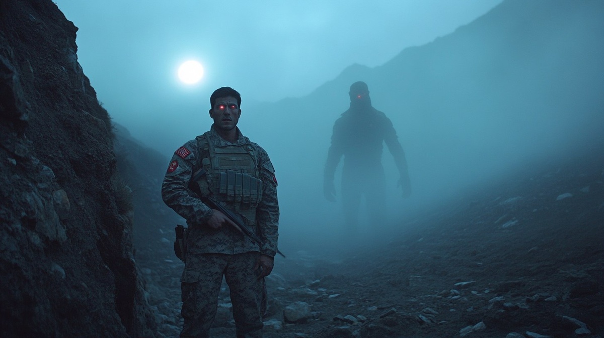 Создано на основе запроса: A Chilean military captain, Esteban Rojas, stands tense in a foggy mountain pass in Nuristan at night