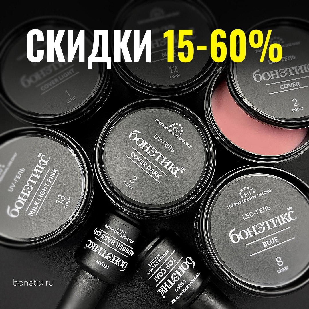 SPRING SALE ☄️ Добавили товары со скидками до 60% в разделе «Текущие Акции » (обновлено 29-04-25) 🛒 Перейти в раздел 🔠 Количество товаров в акции как всегда ограничены. 🪄 СКИДКА -60% на каучуковые базы Бонэтикс™ в фасовке 15г: Цена по акции 217.20 руб. 543 руб. (Экономия 198 руб.) База каучуковая Бонэтикс™ Cover 15ml База каучуковая Бонэтикс™ Light Pink 15ml База каучуковая Бонэтикс™ Milky 15ml База каучуковая Бонэтикс™ Peach 15ml База каучуковая Бонэтикс™ Pink 15ml База каучуковая Бонэтикс™ Rosy 15ml База каучуковая Бонэтикс™ Red Wine 15ml 🪄СКИДКА -25% на гели Бонэтикс™ в фасовке 30г: Цена по акции 596.25 руб. 795 руб. (Экономия 198 руб.) №2 Гель Бонэтикс™ Cover 30г №11 LED-Гель Бонэтикс™ Clear 30г №10 UV-Гель Бонэтикс™ Thick 30г Жидкая Гель-база Бонэтикс™ Hybrid Clear 30г №12 Гель Бонэтикс™ Milk 30г №13 Гель Бонэтикс™ Milk Light Pink 30г №1 Гель Бонэтикс™ Cover Light 30г №22 Гель Бонэтикс™ Black Vitrage 30г №4 Гель Бонэтикс™ French Pink 30г №3 Гель Бонэтикс™ Cover Dar