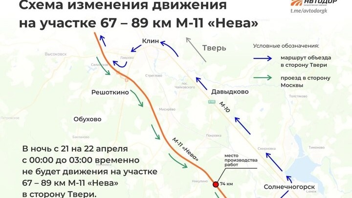 В ночь с 21 на 22 апреля на несколько часов будет перекрыт участок трассы М-11 "Нева", проходящий через территорию Тверской области.