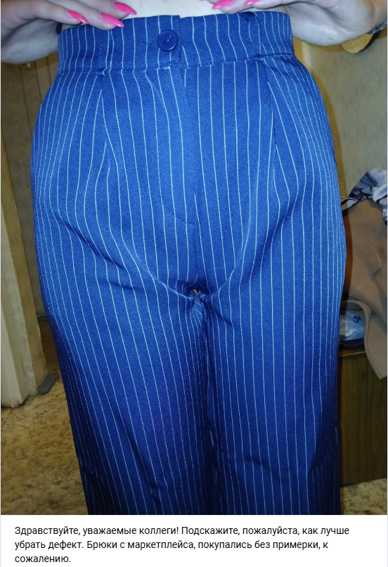 Наверное, могло бы быть смешно, но это все ужасно грустно. И за того, кто это производит, и за того, кто это покупает Вопросов тут множество. Первый и главный: зачем такое покупать? Даже на МП есть возврат, даже, если покупка была без примерки... Впрочем, давайте традиционно про это забудем и будем рассуждать исключительно с точки зрения технологии Тут возникает второй вопрос: точно ли это перед брюк? Может, ультрамодный дизайн с гульфиком на попе? Нуачо, если задние половинки можно наперед, то почему нельзя гульфик назад? Ладно, оставим и это, тем более, фото сзади у нас нет. Будем отвечать на заданный вопрос, как исправить Для исправления такого дефекта в готовых брюках придется почти полностью перешить. Поэтому дважды подумайте, прежде, чем покупать что-то с такой посадкой. И не удивляйтесь, если Мастер вам выставит цену за ремонт, близкую к пошиву брюк с нуля Выпарываем пояс и молнию, расправляем передние половинки и срезаем все лишнее. Как именно? Читаем ниже Складку тоже лучше ра