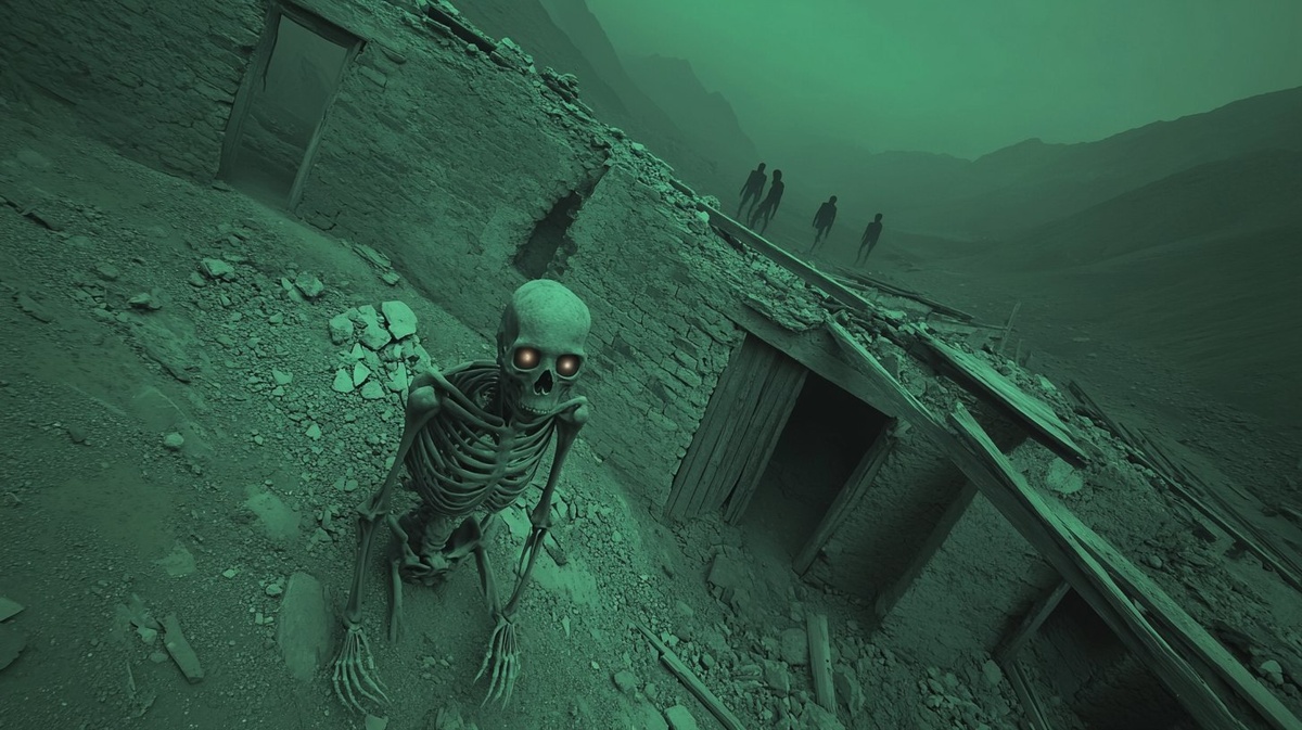 Создано на основе запроса: A night vision drone footage view of a ruined village in the mountains of Badakhshan