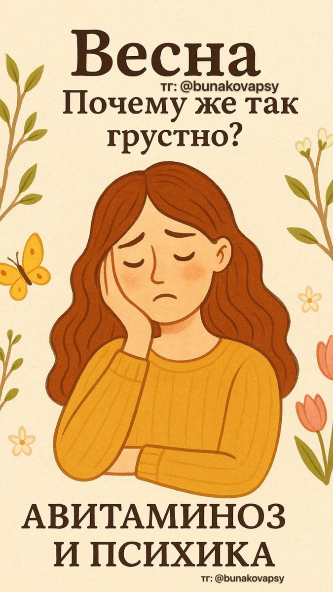 Казалось бы, всё оживает — природа, солнце, надежды. А внутри — усталость, апатия, тревожность. Радость как будто не пробивается сквозь серые очки. Если тебе знакомо это состояние — пожалуйста, знай: ты не один(а), и это вовсе не «тебе просто лень» или «ты слабый человек». Очень часто весной организм переживает авитаминоз, и это влияет не только на тело, но и на психику. ☀️ Почему так происходит? Зимой мы получаем меньше солнца и свежих продуктов, и к весне запасы витаминов истощаются. Особенно страдают: — Витамин D, который помогает вырабатывать серотонин — гормон хорошего настроения — Витамины группы B — отвечают за работу нервной системы и психоэмоциональное равновесие — Железо — помогает доставлять кислород в мозг, поддерживая бодрость — Магний — снижает уровень стресса и помогает адаптироваться к нагрузкам Когда этих веществ не хватает, мозг работает медленнее, эмоции становятся нестабильными, тревожность усиливается, появляется раздражительность и апатия. А мы думаем — «что