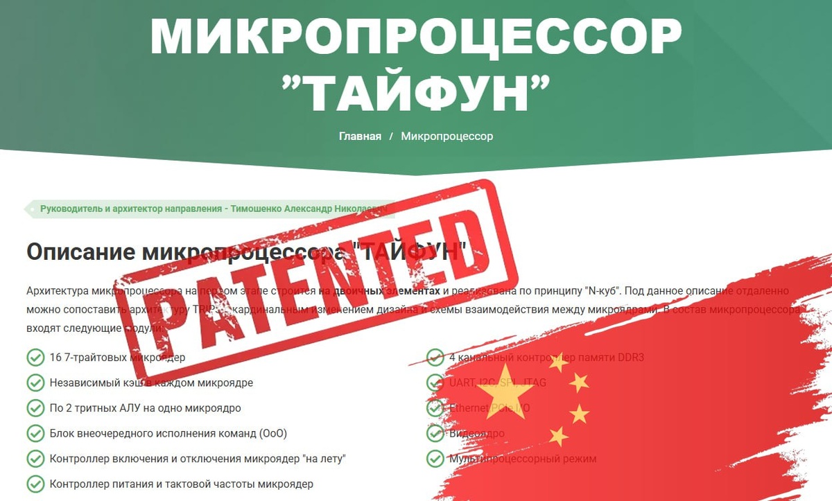 Китайцы запатентовали российскую технологию 7 февраля 2025 года гендиректор компании "Тайфун" Александр Тимошенко представил на конференции в МГУ технологию троичных вычислений. И уже в марте китайская компания Huawei получила патент на почти идентичную разработку. Компания "Тайфун" занимается проектированием микропроцессоров на основе троичной логики с низким электропотреблением на базе собственной архитектуры. Тимошенко отметил, что китайский представитель на конференции активно интересовался технологией, предлагая сотрудничество, а в патенте Huawei использованы схемы из его презентации, включая преднамеренные ошибки, которые, впрочем, не помогли защититься от копирования. Троичная логика (−1, 0, +1) перспективна для ИИ, шифрования и майнинга. В отличие от двоичной системы (0 и 1), она позволяет ИИ работать быстрее и добавляет состояние "не знаю". Китайские компании активно развивают эти направления, поэтому и заинтересовались российской разработкой. Современные чипы основаны на