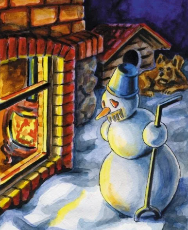 Сегодня стоит сильный мороз. Такой мороз, что даже слышно, как он хрустит. И были сделаны глаза, а вот границу рта изображал небольшой кусок железа. Стал на него лаять и старый пес, который предсказывал ему, что вскоре появится солнце, которое его растопит и расплавит на части. Погода уже несколько раз менялась, и все теперь было украшено крупинками снега. На них распустились белые цвета и поэтому стали заметны мелкие ветки, которых зимой совсем не было видно. Поэтому и богатство бриллиантов вокруг засверкало. А вскоре вышла и молодая пара, которая сразу же заметила все это зимнее великолепие. И эта пара восхитилась и им, ведь им очень понравился стоящий снеговик. И потом они стали продвигаться вперед, и был слышен хруст под ногами. Снеговик спросил у собаки, знает ли она эту пару. И та ответила, что знает, а затем собака рассказала историю своего детства. Тогда она не мерзла, так как у нее был мягкий пуфик, на котором она лежала. А лапки ей протирали мягкой тряпочкой. А потом ее отпра