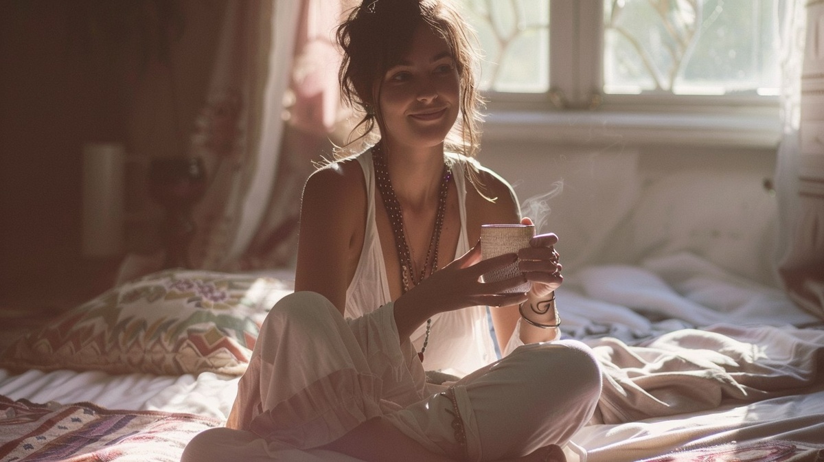 Создано на основе запроса: A woman in her 30s sitting on her bed, morning light pouring in, holding a cup of herbal tea with both hands in