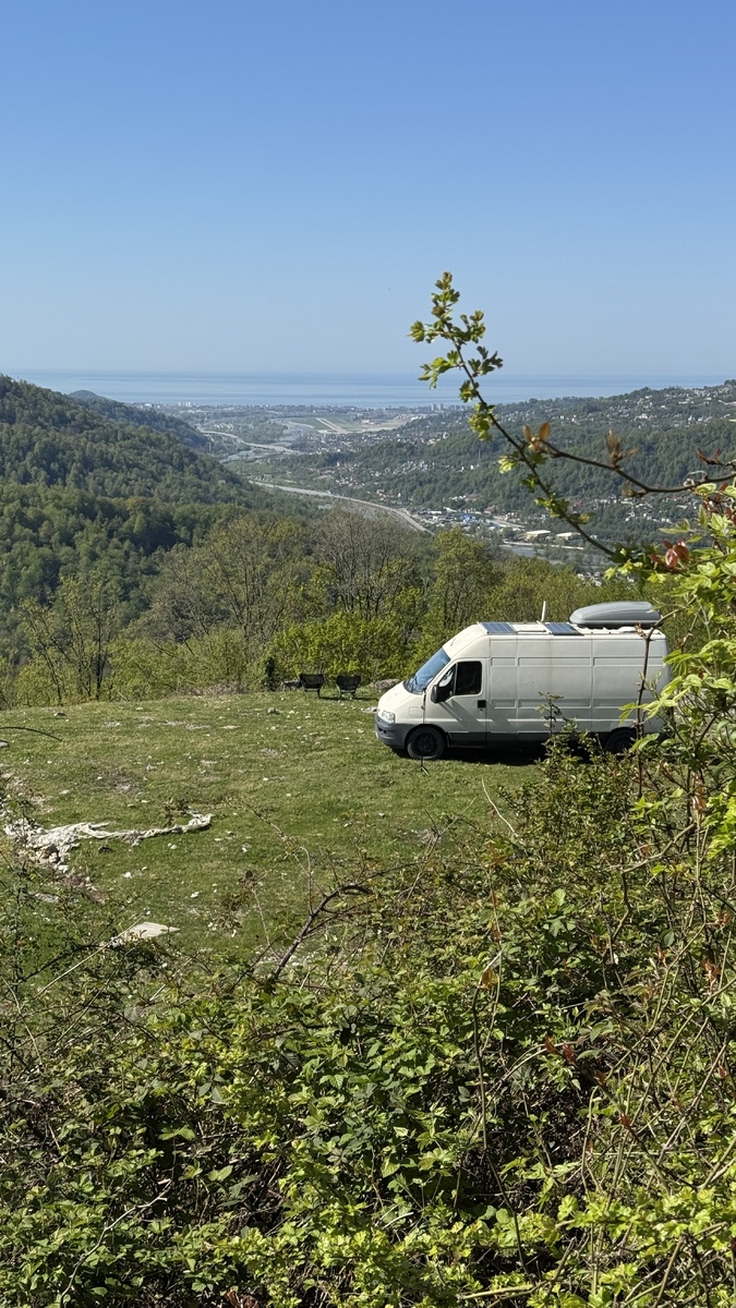 Если бы у Сочи был балкон — он находился бы здесь. Мы нашли это место не в рейтингах и не в туристических подборках, а в приложении Go Vanlife. Решили попробовать — и не пожалели ни на минуту. Эта точка мгновенно вошла в наш личный топ смотровых и ночёвок. Представьте: вы едете по маршруту из Сочи в Красную Поляну. Уже ближе к вечеру, хочется остановиться, выдохнуть, передохнуть. И тут — поворот. Никаких указателей, кафе, сувенирных лавок. Просто поднимаешься наверх — и оказываешься в совершенно другом мире. Что вас ждёт на этой точке? Вечером мы стояли на краю обрыва, смотрели, как самолёты заходят на посадку прямо перед глазами. Внизу — Адлер, в закатных огнях. Позади — горы, тишина, воздух, в который будто подмешали свободу. Мы поставили автодом, поужинали, достали плед и просто сидели, глядя на то, как засыпает город. А утром… Утром было совсем другое настроение. Кофе из термоса, лёгкий туман, лошади проходят рядом, коровы где-то переговариваются внизу. Всё медленно, мягк