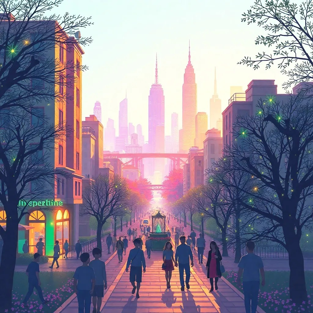 На юге, в Альфа Центавре, жизнь текла своим чередом. Неужелия опять исчезла, оставив Стефи наедине с её мыслями. Она сидела у окна, любуясь закатом, и мечтала о том, как бы ей хотелось оказаться в будущем, где всё было бы идеально. В этом мире не было ни войн, ни болезней, ни конфликтов. Люди жили в гармонии с природой и друг с другом, просто и счастливо. Внезапно она почувствовала лёгкое покалывание в затылке, и всё вокруг словно растаяло. Постепенно стали появляться очертания огромного города. Улицы сияли, а здания, словно кристаллы, переливались всеми цветами радуги. На улицах гуляли люди, улыбаясь и спокойно беседуя друг с другом. Дети играли в парках, деревья шептались между собой, а цветы, казалось, светились изнутри. Стефи шла по мостику, соединявшему два небоскрёба, и вдруг заметила, что воздух чист и свеж, а небо — невероятно голубое, без единого облачка. Вокруг неё летали дроны, аккуратно доставляя подарки и продукты по нужным адресам. В домах стали загораться лампочки, осве