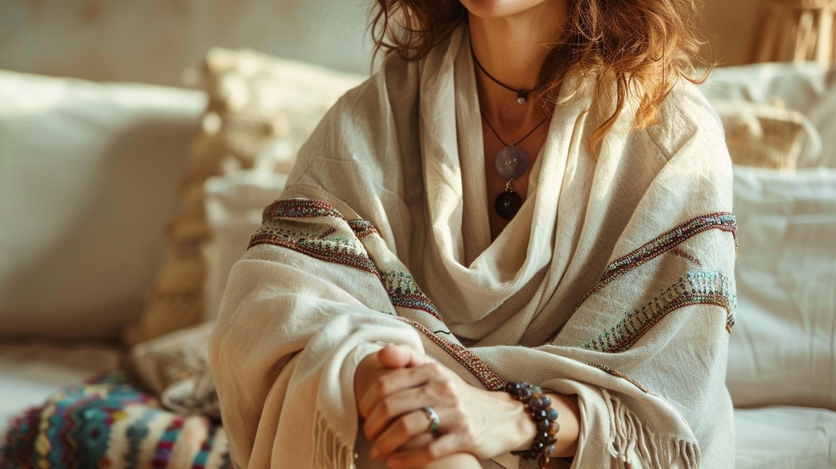 Создано на основе запроса: A serene woman sitting cross-legged in a softly lit room, wearing a shawl, smiling gently