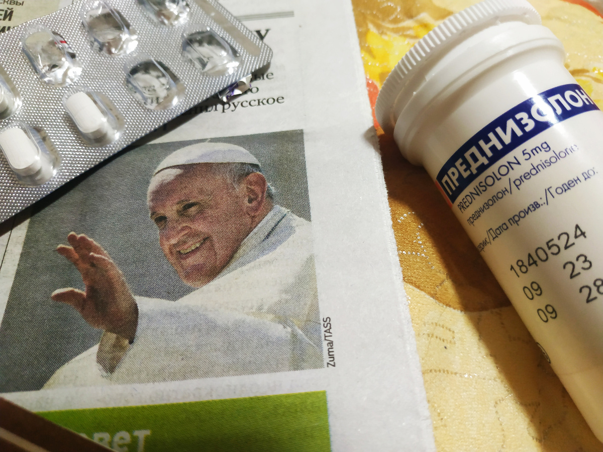 Два месяца назад в возрасте 88 лет он был госпитализирован с бронхитом в университетскую больницу Джемелли. Сначала врачи диагностировали сложную вирусную, бактериальную и грибковую инфекцию. А затем распознали пневмонию в обоих лёгких. Врачи прописали "абсолютный покой" и комбинацию кортизона (глюкокортикоидный гормон) и антибиотиков. Затем у Франциска снизился уровень тромбоцитов. Трмбоциты- это клеточные фрагменты, которые снижают кровотечения, помогают заживлению ран. Низкий уровень тромбоцитов в данном случае мог быть побочным действием лекарств. У Франциска также развилась анемия. Это обычное осложнение при лечении ГКС, преднизолоном. Поэтому при длительном лечении глюкокортикостероидами нужно сдавать анализы крови раз в месяц. Понтифику ввели гематин, препарат, повышающий уровень гемоглобина, главного поставщика кислорода в клетки. День спустя, врачи сообщили, что терапия оказалась эффективной.