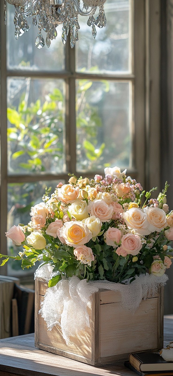 Создано на основе запроса: In the office, there is an exquisite wooden box containing various beautiful and delicate flowers in light pink and yellow-green colors. There was also some white gauze fabric wrapped around them to add softness and charm. The background features a crystal chandelier hanging from above, creating a warm atmosphere with sunlight shining through the large windows. In front of it were two neatly arranged books on the desk, adding a touch of elegance to the overall scene. --- Автоперевод: В офисе есть изысканная деревянная коробка, содержащая различные красивые и нежные цветы в светло-розовых и желто-зеленых цветах. Хорошо вышло? 🤔 https://dzen.ru/id/65c0c65c86e4f837c27b24d7 #ИИ #AI #нейросеть #midjourney #art