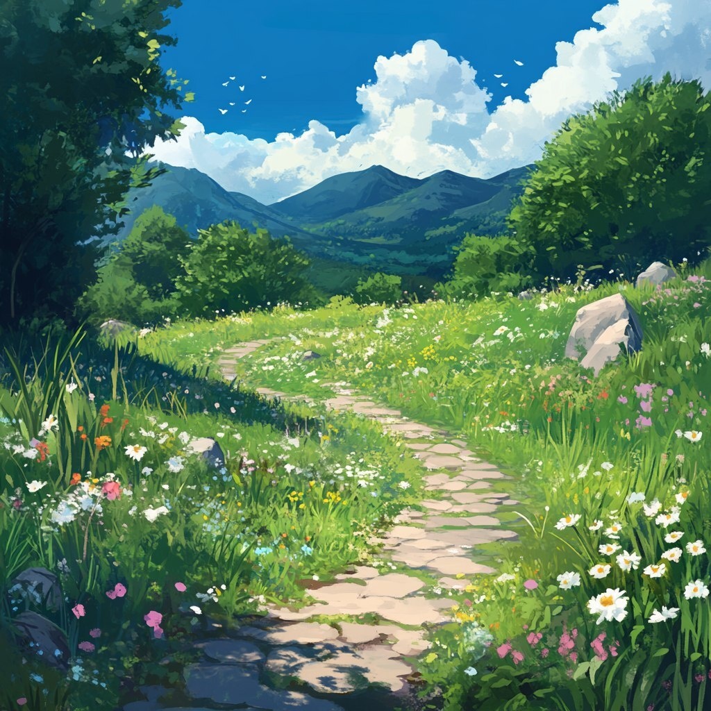 Создано на основе запроса: a path through a meadow. Ghibli style illustration