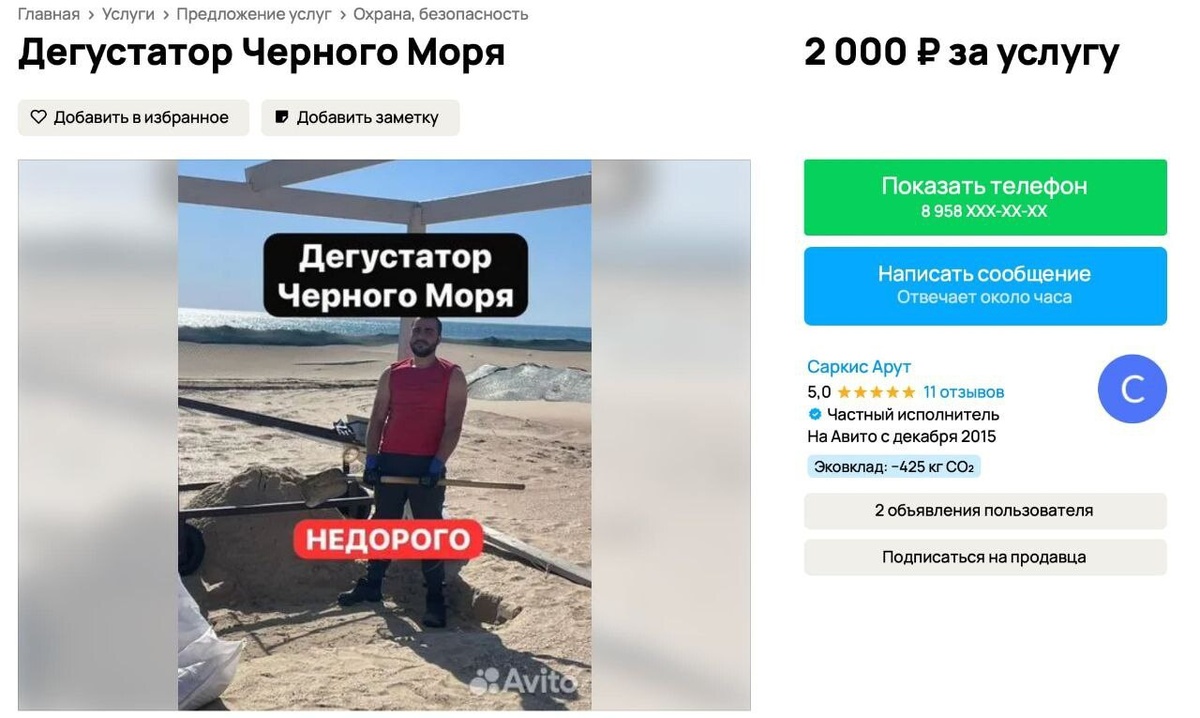Автор публикации предлагает вакансию по оценке качества морской воды в акватории курорта. У продавца есть два пакета предложений. Автор объявления предлагает бесплатную оценку перспектив отдыха в Анапе для туристов, готовых остановиться в одном из отелей поселка Джемете, и платную – для всех остальных. По утверждению автора, чистота морской воды на побережье настолько высока, что там можно встретить дельфинов.