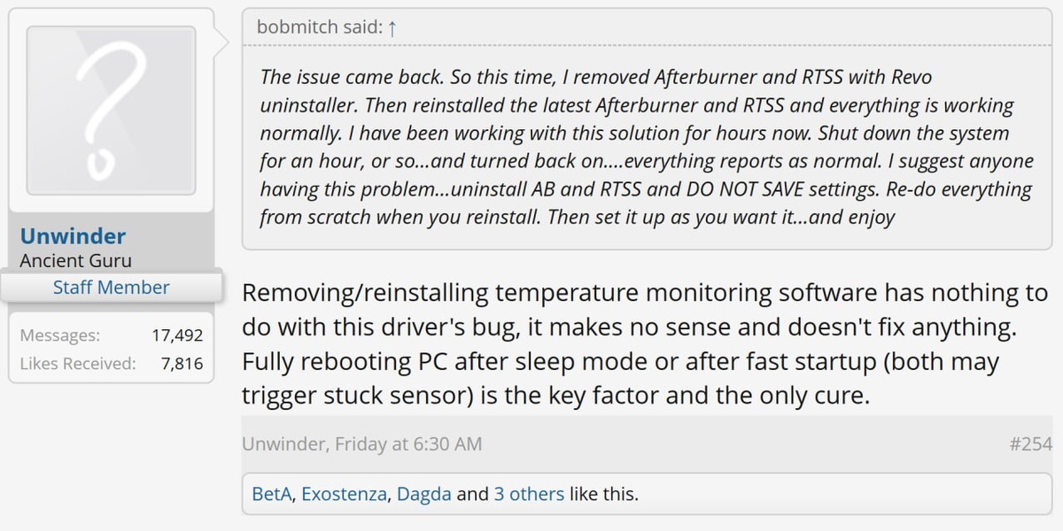 Драйвер NVIDIA GeForce 576.02, выпущенный для устранения багов с черным экраном, сам оказался проблемным: у части пользователей сбоит датчик температуры GPU. Из-за этого карта может неправильно выставлять частоты и напряжения. Проблема связана с API NvAPI_GPU_GetThermalSettings, который зависает после выхода из сна. Автор MSI Afterburner заявил, что причина — в драйвере, а не в стороннем ПО. Единственный способ восстановить работу — перезагрузка. Затронуты могут быть и RTX 30/40. NVIDIA официально ошибку не признала.
