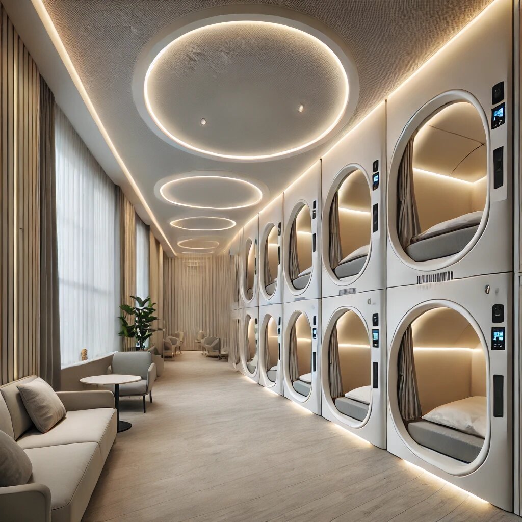 Капсулы с современным интерьером, системой вентиляции, индивидуальным светом и розетками. Есть комнаты отдыха, душевые, камеры хранения.