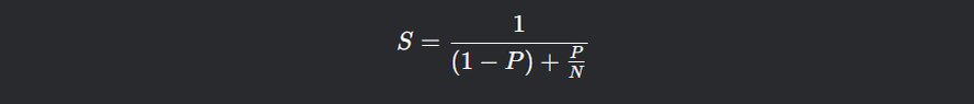 Ускорение выполнения программы (S) при использовании (N) процессоров зависит от доли кода, которую можно распараллелить (P), и вычисляется по формуле:
