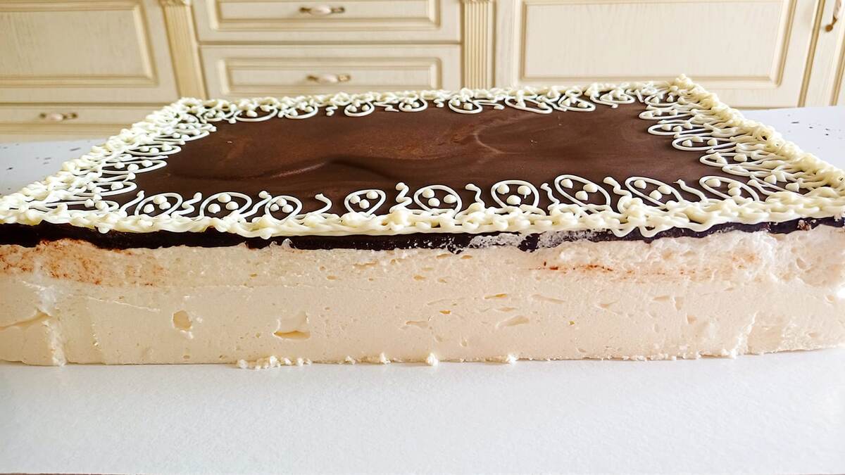 Дополнительно украсил торт белым шоколадом, чтобы придать ему завершённый вид.Торт птичье молоко, это не только очень вкусный торт с нежным суфле и рассыпчатыми коржами, это ещё ностальгия, по классическому вкусу, традиционного десерта советской эпохи.