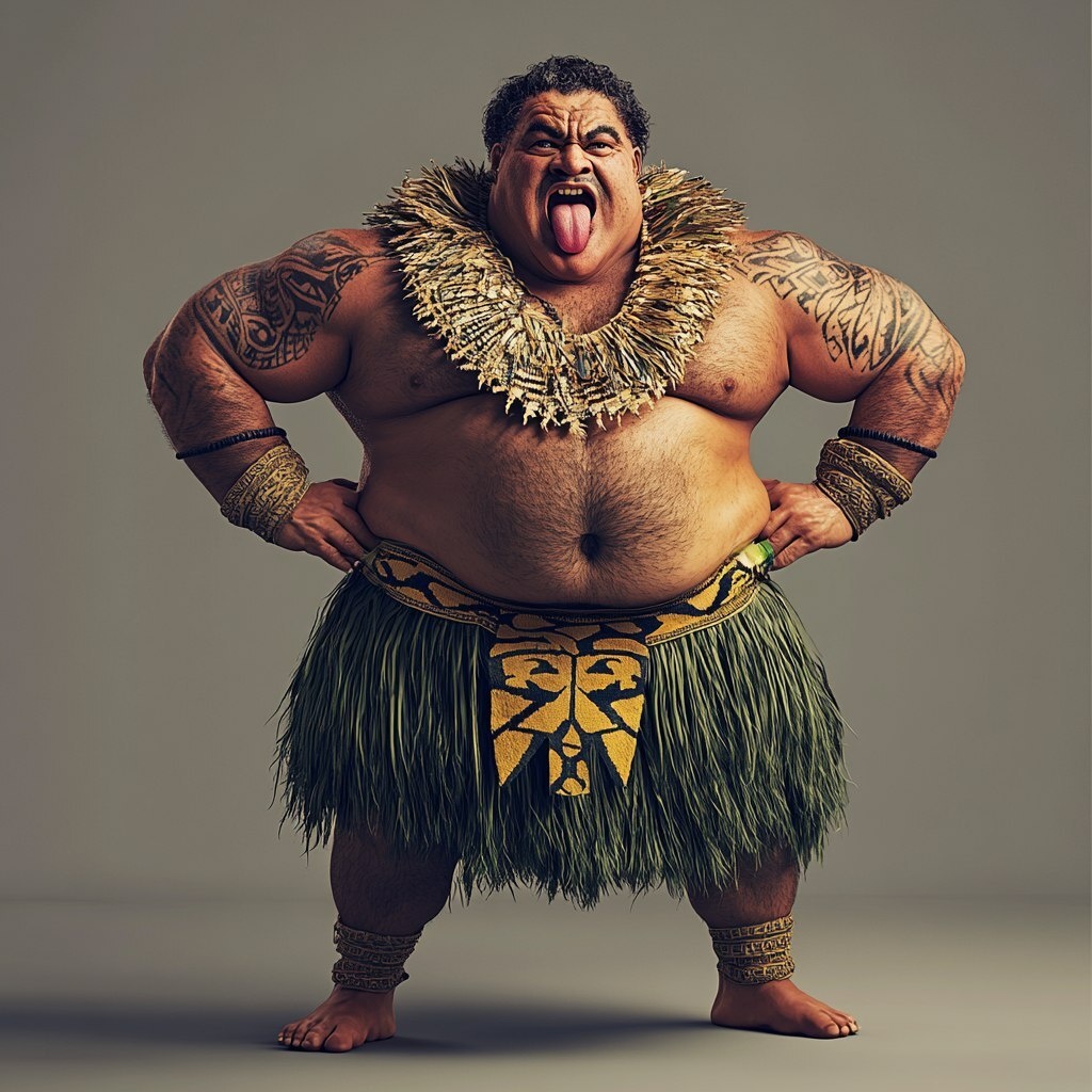 Создано на основе запроса: large kiwi man, tongue out, doing the haka