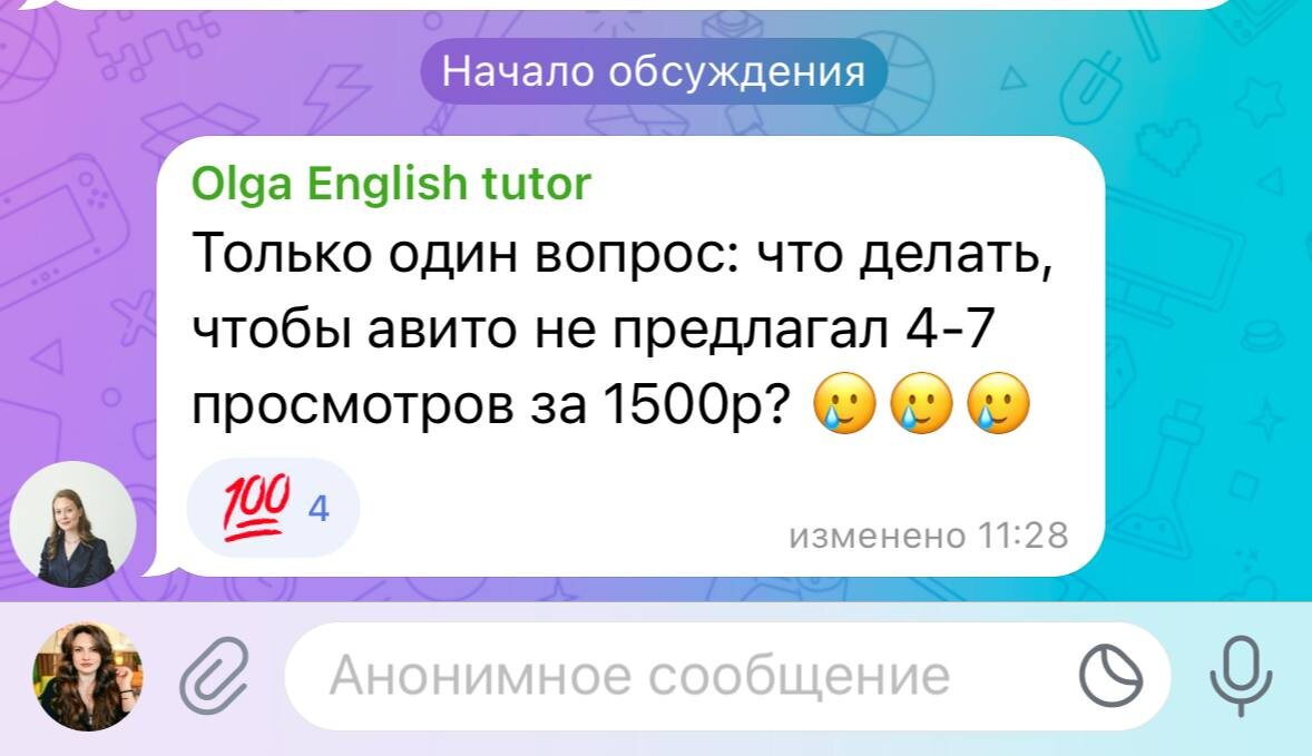 Почему продвижение на Авито бывает очень дорогим? Когда я запускала одни и те же объявления на одну и ту же гео, за условную тысячу рублей Авито предлагал мне то 120 просмотров, то 12. Это яркий пример того, что на Авито есть сезонность, когда одновременно рекламу запускают очень много школ и преподавателей, потому что есть большой спрос от клиентов, а это: Начало учетного года Посленовогодний период Конец апреля-май Но есть еще менее выраженные всплески в другие периоды в разных нишах. И если конкуренция высокая, это не значит, что вам ничего не светит на площадке. Вы должны быть хитрее: Знать, в какой сезон стоит делать массовый набор и забивать себе все расписание, чтобы спокойненько работать исходя из ВАШЕЙ НИШИ (в разных нишах сезонность разная) Уметь находить рабочие связки в ваших объявлениях, чтобы оптимизировать бюджет Ведь одно и то же объявление на разной географии с одним и тем же бюджетом может дать вам и 100 просмотров, и 300. А значит во втором случае, вы можете