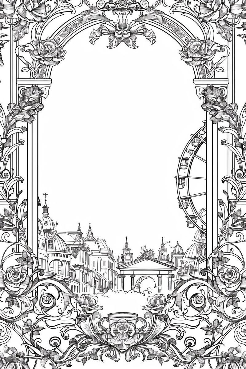 Создано на основе запроса: delicate mandala-style floral border with Viennese details, thin symmetrical line art, around the edges of an A5 page, frame width no more than 2cm, includes elements like baroque ornaments, Viennese roses, ferris wheel, classical buildings, coffee cups, suitable for kids travel journal, coloring book style, black outline only, white background --- Автоперевод: Деликатная цветочная граница в стиле мандалы с венскими деталями, тонкая симметричная линейная искусство, вокруг краев страницы A5, ширина рамы не более 2 см, включает в себя такие элементы, как украшения для барокко, венские розы, колесо обозрения, классические здания, кофейные чашки, подходящие для детских туристических журналов, цветовой книжной книжной, только черного наброса, белого фоне, фона Как тебе вариант? 🤔 https://dzen.ru/id/65c0c65c86e4f837c27b24d7 #ИИ #AI #нейросеть #midjourney #art