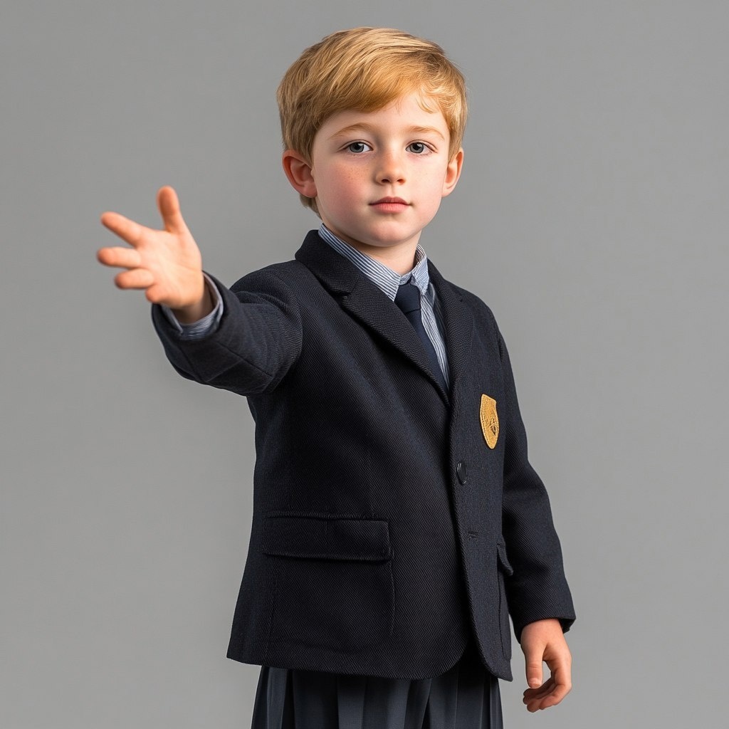 Создано на основе запроса: boy in school uniform blazer, short blonde hair. Full body, 3 quarter view, arm out reaching, Photo realistic, studio lighting, grey background. --- Автоперевод: Мальчик в школьной форме пиджак, короткие светлые волосы. Что думаешь? 🤔 https://dzen.ru/id/65c0c65c86e4f837c27b24d7 #ИИ #AI #нейросеть #midjourney #art