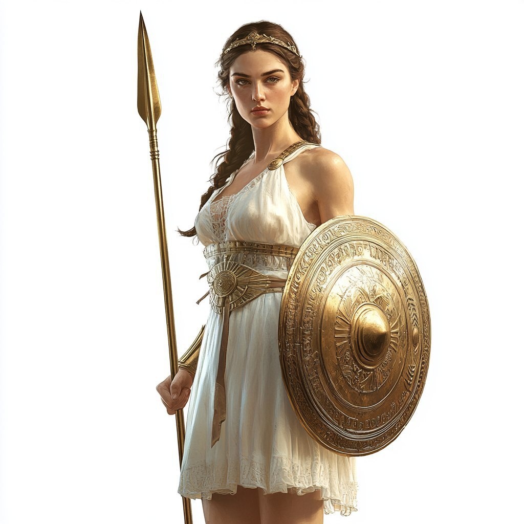 Создано на основе запроса: Full-body portrait of the Greek goddess Athena, standing and holding a golden shield and spear
