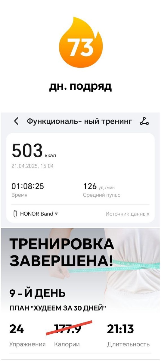 🏋️♂️ Упражнения. День 73. 🗓 21.04.25 💪 День похудения: 103 ⏱ 01:08:25 🏄♂️ 503 ккал 🤦♂️ Поверил в свои силы... Думал смогу сделать упражнения для мышц груди и спины продолжающего уровня... Не тут то было, я сдох на половине комплекса... 💪 Но потом я перешёл на начинающий уровень в остальных программах и добил сегодня 500 ккал на тренировке. ✍️ Присылайте в комментарии свои активности за день! #жжем_калории 😎 Roman Legas | Life