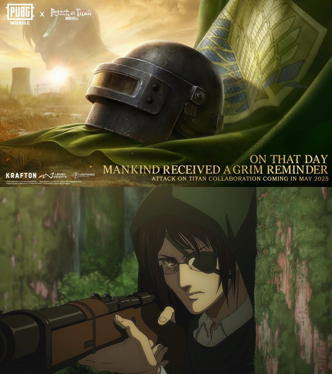 PUBG и Attack on Titan — коллаб начнётся в мае Разработчики тизерят: ▫️Тематику AoT ▫️Контент и, возможно, режим с Титанами ▫️Рост персонажей до исполинских масштабов Подробностей немного, но звучит уже мощно
