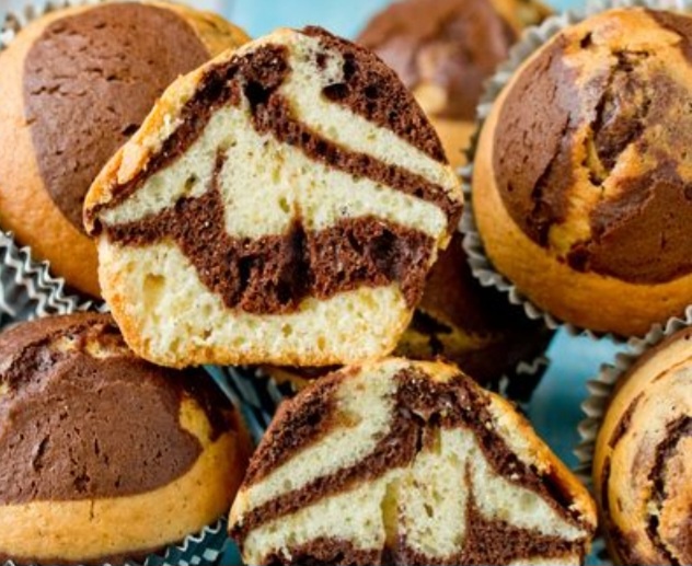 СМЕТАНА 125 г МАСЛО РАСТ. 100 мл ЯЙЦА 3 шт САХАР 150 г МУКА 225 г ( 1.5 стак. ) РАЗРЫХЛИТЕЛЬ 15 г КАКАО 25 г ВАНИЛИН 2 г Яйца с сахаром взбить до пышной белой массы. Добавить масло, сметану, ванилин. Смешать. Муку смешать с разрыхлителем. Отделить 25 г муки. Остальную муку смешать с жидкой массой. Массу разделить на 2 части. В одну часть добавить 25 г какао, в другую, отложенные, 25 г муки. Духовку разогреть, формы смазать. В форму выкладывать поочерёдно ложку белого теста, ложку тёмного. Заполнить на 3/4 объёма. Выпекать 20-30 минут при 180 град., проверить на готовность шпажкой.