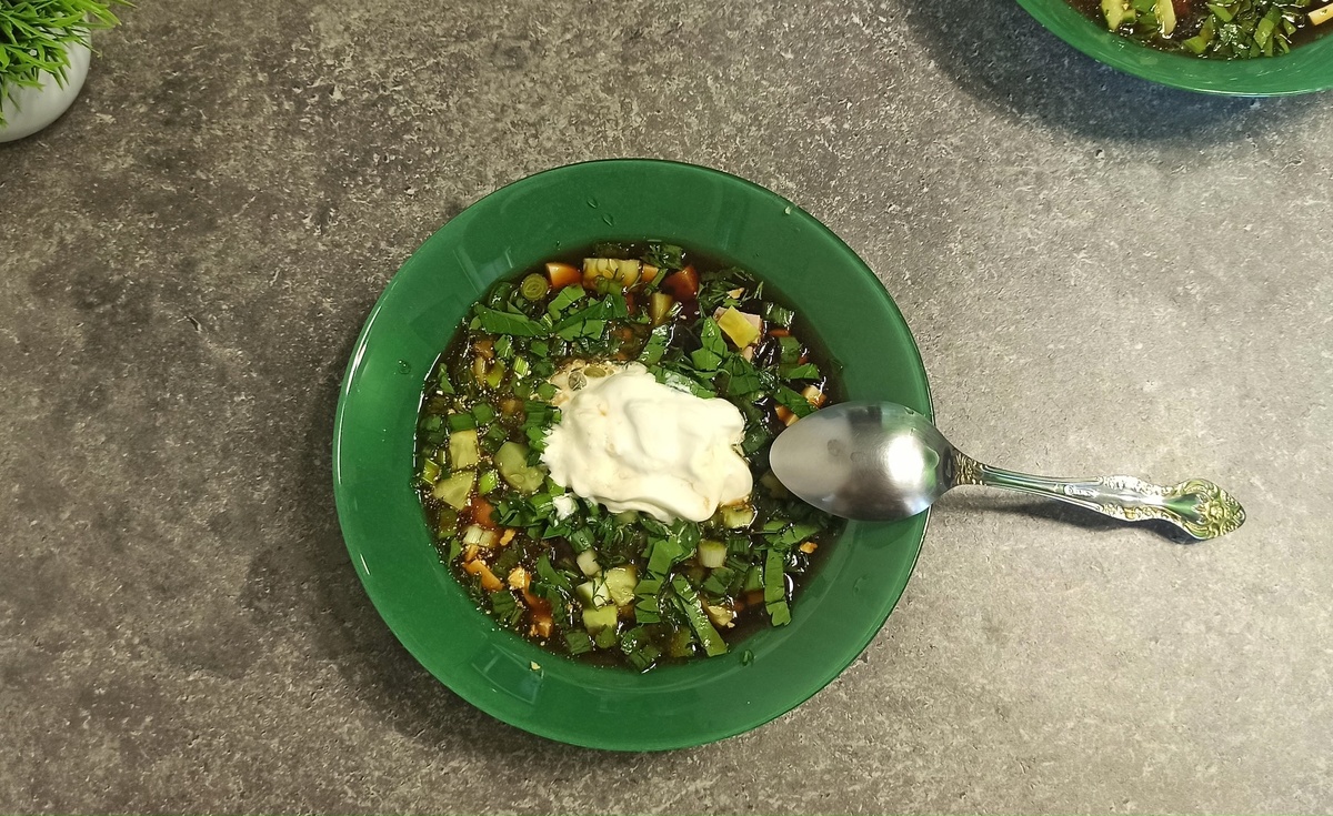 Я просто обожаю эту окрошку! Особенно, когда в ней используется новомосковская колбаса или кусочек запеченного мяса. Этот суп идеально освежает в жаркие дни, а немного сладковатый квас из холодильника придает ему особую нотку. Ингредиенты на 1 порцию: Приготовление: Начинаем с нарезки вареного яйца, огурца и колбасы (или мяса) на небольшие кубики и закидываем в тарелку. После тщательно моем лук, укроп и петрушку и нарезаем их. Срезаем микрозелень и добавляем к овощам. Я обычно использую микрозелень редиса, лука-батуна, брокколи, или горчицы. Ориентируйтесь на собственные вкусовые предпочтения. Я готовлю окрошку порционно для каждого члена семьи, чтобы каждый мог добавить нужное количество сметаны и кваса по своему вкусу. Кроме того, не все добавляют сюда соль. Однако можно замешать ингредиенты в отдельной миске, а затем разложить их по порционным тарелкам. 😊 Добавляем к ним сметану, квас и немного соли. И наслаждаемся освежающим вкусом окрошки в компании друзей или семьи! Приятного ап