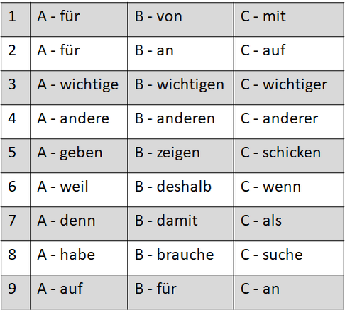 Попробуйте решить данный тест на лексику и грамматику самостоятельно. Если сложно, то включайте видео и делайте задание вместе со мной. Я подробно разобрала все лексические конструкции для вас! вставьте слова из предложенных вариантов Sehr geehrter Herr Müller, ein Freund ______ (1) mir hat mir erzählt, dass Ihr Unternehmen sehr gute Produkte anbietet. Deshalb interessiere ich mich______(2) Ihr Angebot. Am 10. Mai feiere ich meinen Geburtstag mit meinen ______(3) Freunden. Ich möchte für diese Feier einen Catering-Service buchen, der sowohl vegetarische als auch ______ (4) Speisen anbietet. Könnten Sie mir bitte Informationen zu Ihrem Menü ______(5) ? Besonders wichtig ist mir, dass es eine große Auswahl gibt, ______ (6) viele meiner Gäste unterschiedliche
