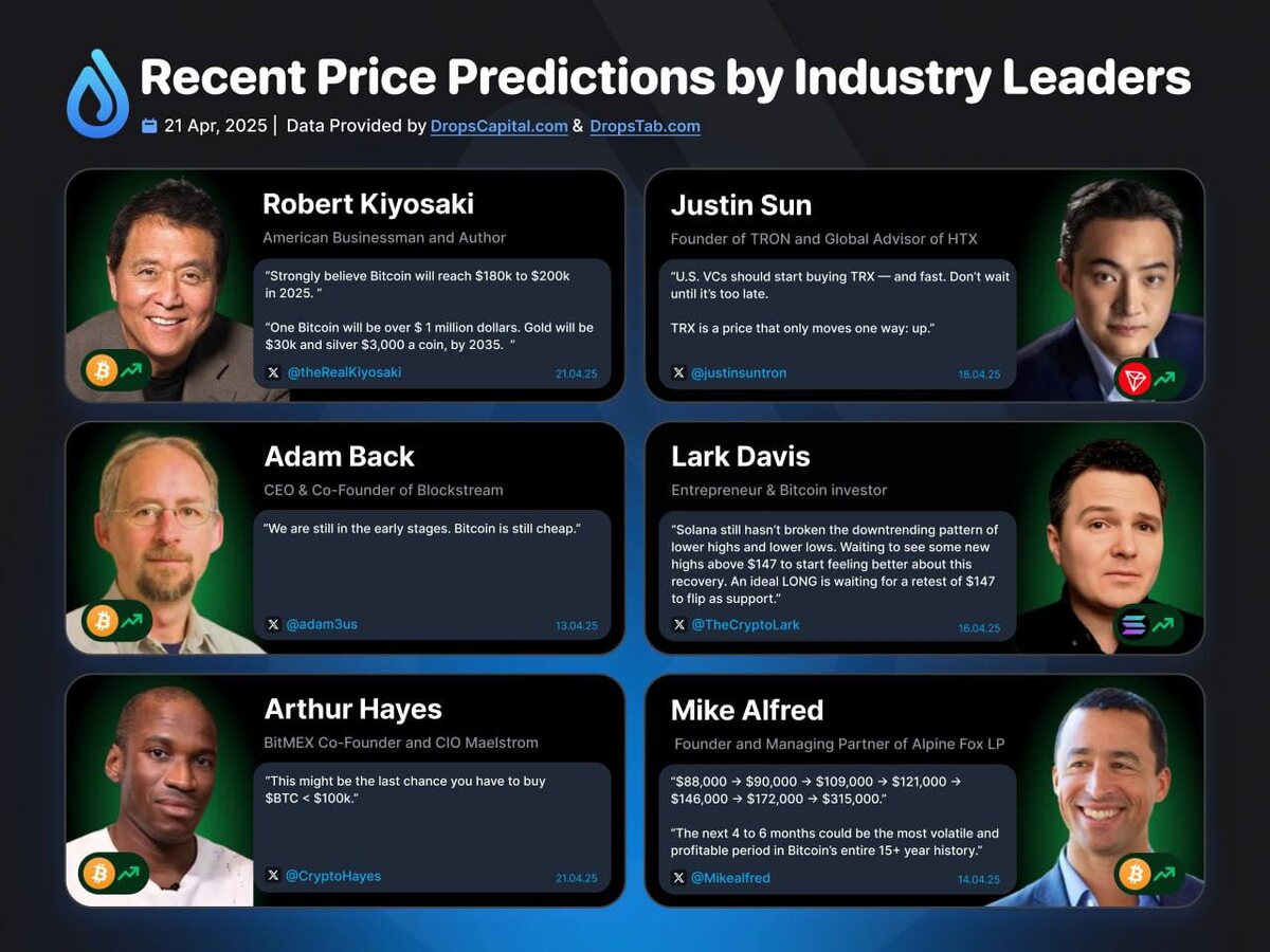 🔸Последние прогнозы по ценам криптовалют от лидеров отрасли: • Роберт Кийосаки : BTC достигнет $180–200 тыс. в 2025 году и превысит $1 млн к 2035 году. • Джастин Сан : TRX движется только в одном направлении: вверх. • Адам Бэк : Мы все еще на ранних стадиях. Биткоин все еще дешев. • Ларк Дэвис : Ideal LONG ждет повторного тестирования SOL на уровне $147 • Артур Хейс : Это может быть последний шанс купить BTC < $100 тыс. • Майк Альфред : Ожидает движения BTC с $88 тыс. до $315 тыс.