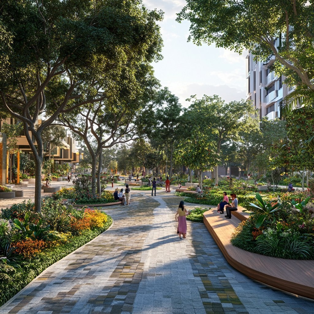 Создано на основе запроса: public space with people and actitivites indian context and green space and landscapes seatting spaces