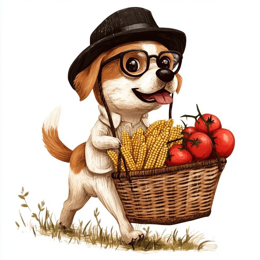 Создано на основе запроса: a painted cartoon of a dog walking a carrying a woven basket full of maize and tomato, do wearing black hat and