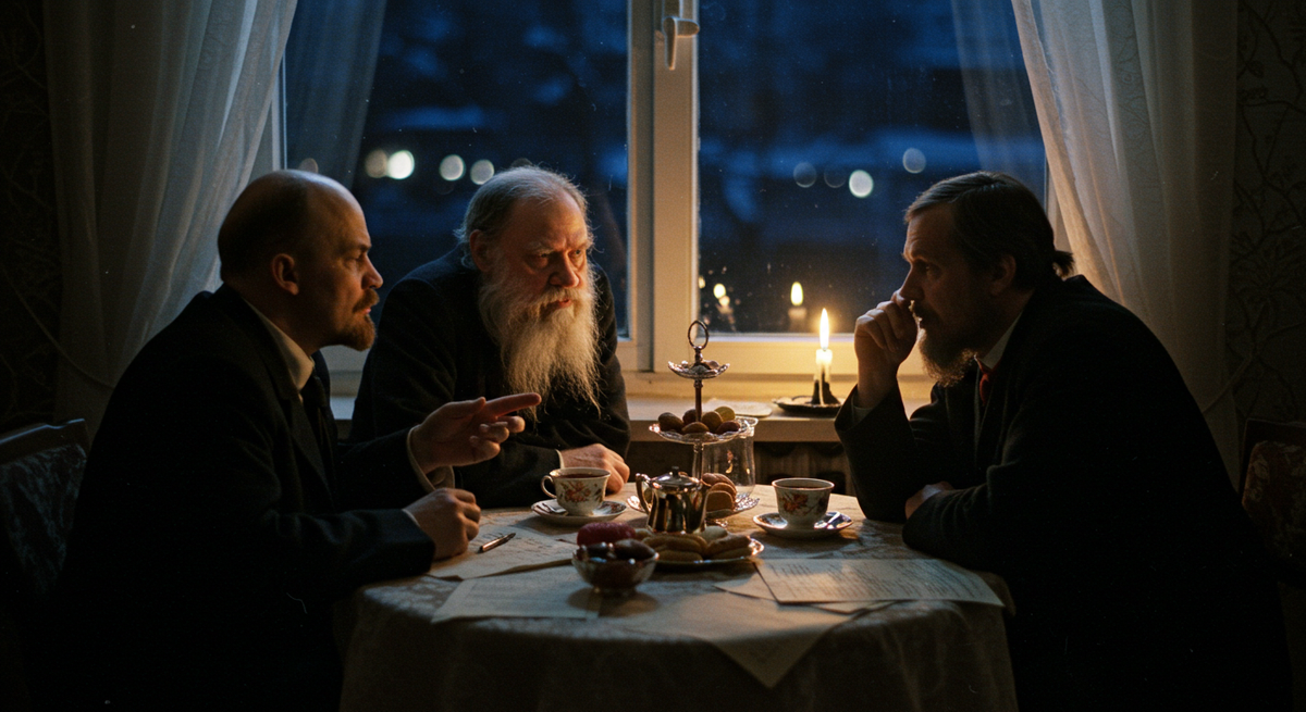 Кабинет Федора Достоевского. Комната погружена в полумрак, освещаемая лишь лампой на столе и отблесками огня в камине. Достоевский, с его пронзительным, лихорадочным взглядом, сидит за столом, нервно перебирая бумаги. Перед ним стоят Владимир Ленин, собранный и нетерпеливый, и Лев Толстой, спокойный, но с заметной внутренней тревогой.