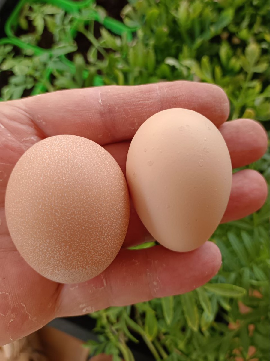 И вторая кура из Chipushilly-Pukatelli сегодня снесло яйцо. Слева коричневая, справа светлая кура. Зелёных нет. От вылупления им получается 4.5 месяца.